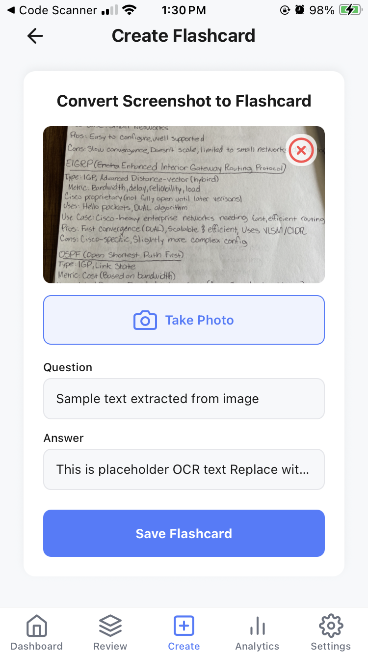Our advanced AI analyzes your screenshots and generates optimized flashcards with questions and answers.